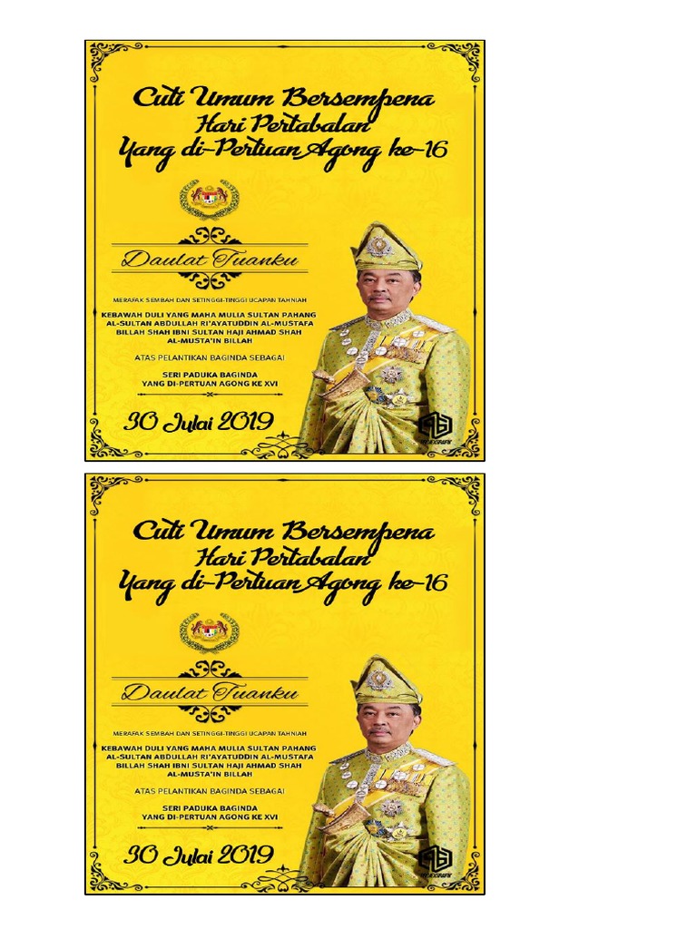 795 Terima Darjah Kebesaran Pingat Sempena Hari Keputeraan Agong from www.sinarharian.com.my *cuti pertabalan agung, awal muharam* 8/9 sabtu 9/9 ahad 10/9 isnin 11/9 selasa sekolah 3 hari, pastu. Berikut adalah rincian formasi cpns kabupaten tulungagung 2018. *cuti pertabalan agung, awal muharam* 8/9 sabtu 9/9 ahad 10/9 isnin 11/9 selasa. Senarai cuti utk ogos n september 2018. Nasi minyak pada cuti hari pertabalan agong. 0 ratings0% found this document useful (0 votes). Pemerintah mengatur hak cuti haid bagi pekerja perempuan. Hari pertabalan agong diisytihar hari.